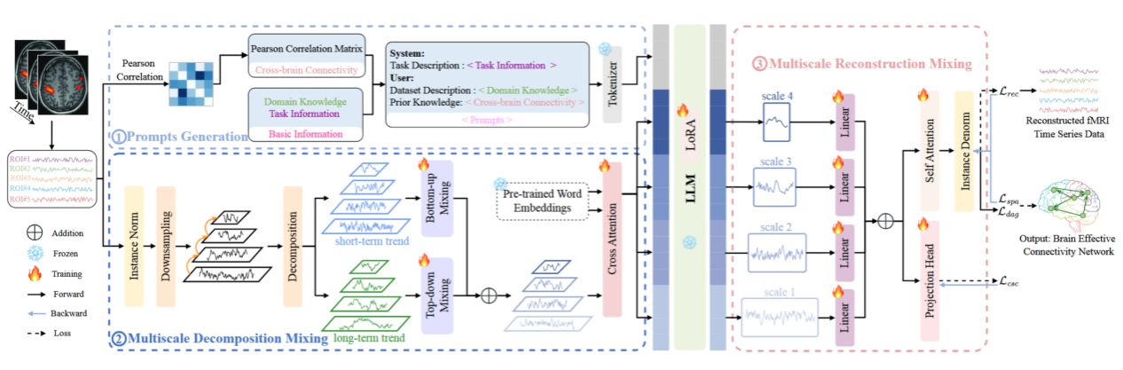 论文《BrainEC-LLM: Brain Effective Connectivity Estimation via Multiscale Mixing LLM》展示了团队在脑效应连接网络学习领域的最新研究成果。预训练大语言模型(Large language models,LLM)在功能磁共振成像(functional magnetic resonance imaging,fMRI)分析与因果发现领域已展现出显著进展。然而,由于因果发现任务专注于从观测数据中提取因果图结构,其与LLM的结合研究仍处于早期探索阶段,尤其在脑效应连接这一子领域中,基于LLM的方法尚未得到充分探索。此外,现有基于LLM的因果发现方法通常依赖迭代式查询以评估变量对之间的因果影响,缺乏模型适应或微调机制,难以处理跨模态差异和复杂因果结构。为此,本文提出了BrainEC-LLM,首次通过微调LLM实现从fMRI数据中估计大脑效应连接(图1)。该方法通过多尺度分解混合模块将fMRI时间序列分解为短期与长期趋势,并以自底向上(由细到粗)和自顶向下(由粗到细)的方式融合多尺度时序特征;同时引入跨注意力机制,结合预训练词嵌入确保fMRI输入与自然语言预训练表示之间的一致性。在模拟和真实fMRI数据集上的实验结果表明,与现有先进方法相比,BrainEC-LLM具有更优的性能。