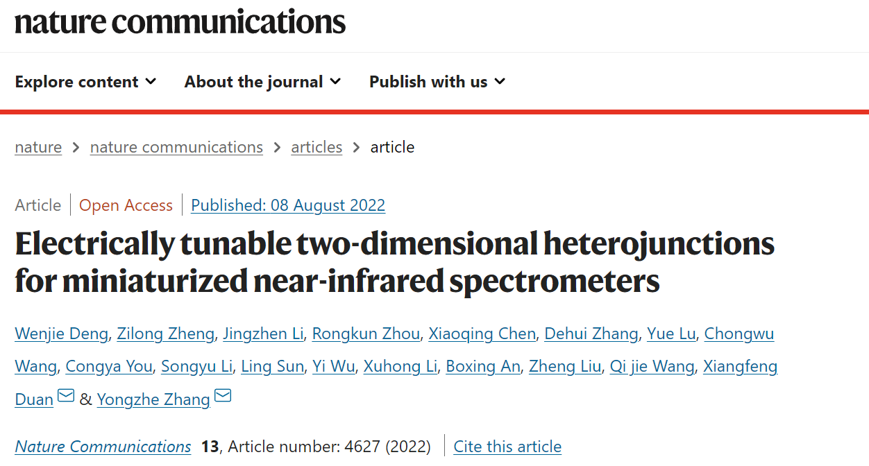 光谱信息探测芯片的开发是新一代信息技术发展的重要研究方向之一。目前,大多数技术路线都采用具有不同光谱响应的光电探测器阵列,或者需要精细集成微米和纳米光学模块,上述依赖于分光物理结构的工作机制面临工艺难度高、光程差限制系统小型化等关键问题。因此,张永哲教授课题组及其合作团队段镶锋教授课题组首次提出了一种基于二维范德华异质结构的超微型片上光谱仪的设计。通过在范德华异质结之间引入具有离域电子轨道的重金属原子,极大地增强了层间耦合并实现了外部电场可调的近红外光响应(1.15 至 1.47 μm)。结合栅控可调的光响应和回归算法,在器件有源区域面积小于10 μm的设备中实现了光谱重建和光谱成像。考虑到超小尺寸和简单的制造工艺,具有可设计带隙能量和增强光响应的范德华异质结构为片上红外光谱提供了有吸引力的解决方案。