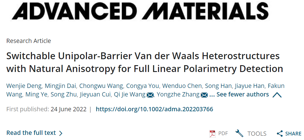 片上可集成的偏振态测量仪是未来高端光电子芯片开发的重要研究方向之一。依赖于人工偏振光学物理结构的路线仍然面临损耗大、工艺难度高等问题。基于天然具有各向异性光学性质的材料体系进行偏振测量技术的进一步开发是具有重要潜力的。鉴于此,张永哲教授课题组及其合作团队王岐捷教授课题组首次提出“用于全线偏振检测的具有天然各向异性的可切换单极势垒范德华异质结构”前沿设计理念。在单势垒能带结构工程的指导下,以b-AsP/WS2/b-BP范德华结构为例,在中红外波段获得了偏置电压可选择的线偏振光电响应特性,揭示了该微器件实现全线偏振态测量的工作机制,并通过基于琼斯矢量描述的偏振态成像演示验证了该器件的实际应用价值,为片上可集成的偏振测量仪器提供了一条具有重要意义的思路。