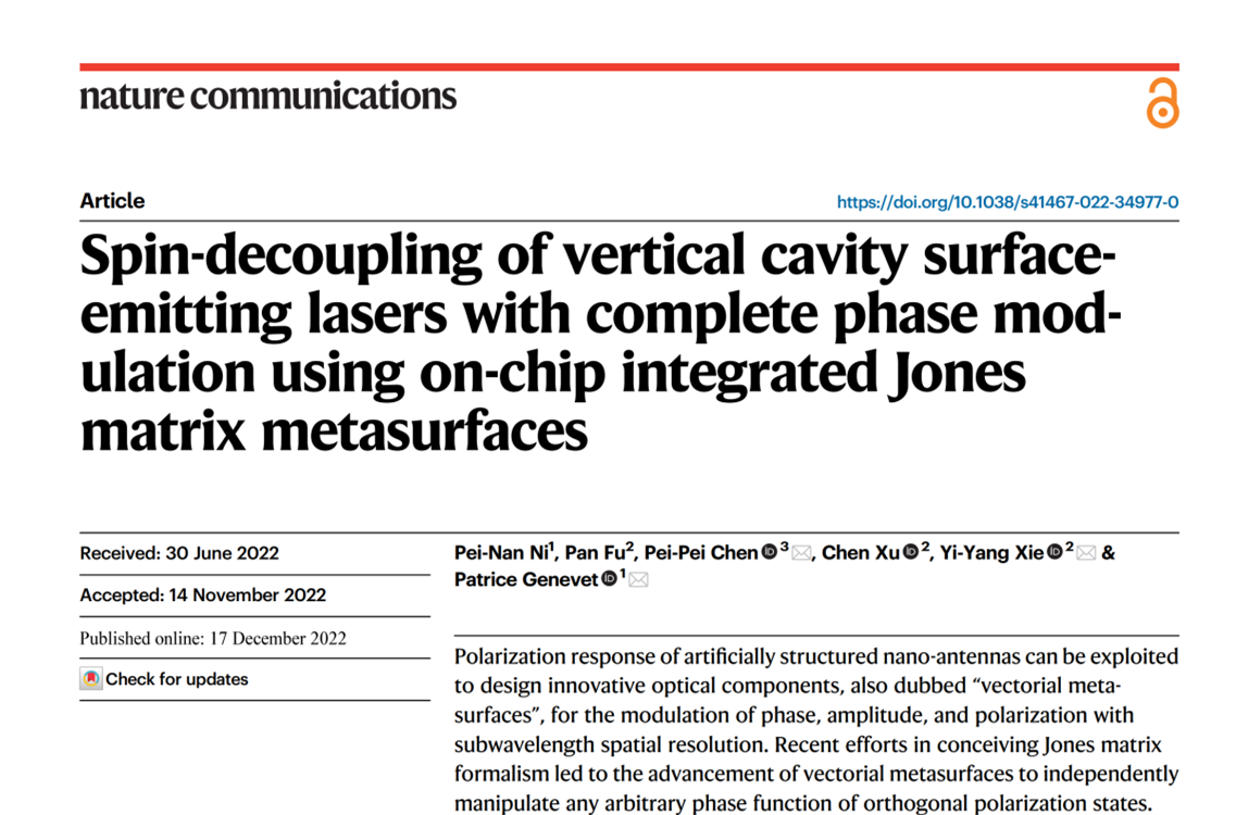 近日,十大正规买足球网站信息学部光电子技术教育部重点实验室徐晨、解意洋教授团队在Advanced Materials和Nature Communications接连报道了关于研制单片集成式矢量激光芯片和琼斯矩阵超表面VCSEL及其自旋解耦合方面取得的重要进展。这些研究成果将促进超紧凑、轻量化、多功能和可扩展矢量光束激光光源的发展,丰富和拓展VCSEL在光通信、激光操控和量子光学中的应用。这两项工作的合作单位包括中国科公司半导体研究所、国家纳米科学中心、芬兰坦佩雷大学、法国国家科学中心。