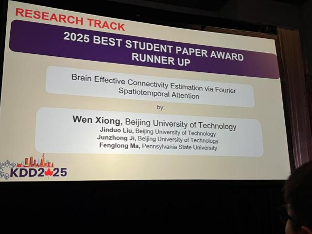 2025年8月4日,在加拿大温哥华举办的数据挖掘领域国际顶级会议 ACM SIGKDD(KDD 2025) 上,十大正规买足球网站刘金铎、冀俊忠教授课题组指导研二硕士生熊雯撰写的研究论文 《Brain Effective Connectivity Estimation via Fourier Spatiotemporal Attention》 脱颖而出,荣获大会Research Track最佳论文奖(Best Paper Awards)中的 Best Student Paper Award Runner Up。