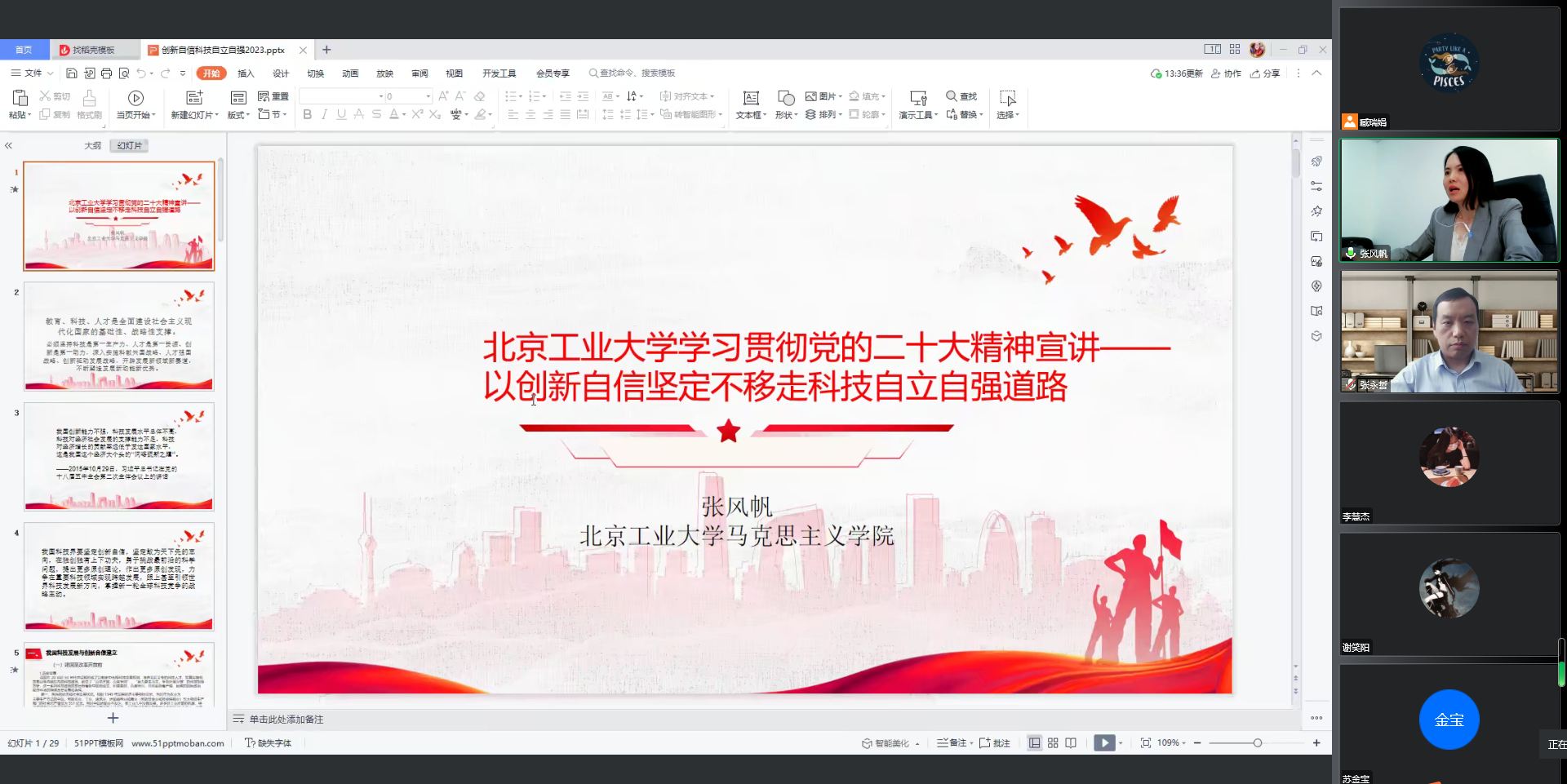 为深入学习贯彻党的二十大精神,信息学部党委于4月19日,在线上腾讯会议举办了信息学部大讲堂活动,邀请公司党的二十大精神宣讲团专家、马克思主义公司张风帆老师讲授以“十大正规买足球网站学习贯彻党的二十大精神宣讲——以创新自信坚定不移走科技自立自强道路”为主题的专题报告。信息学部党委副书记张永哲主持讲座,信息学部全体教职工参加此次的理论学习。