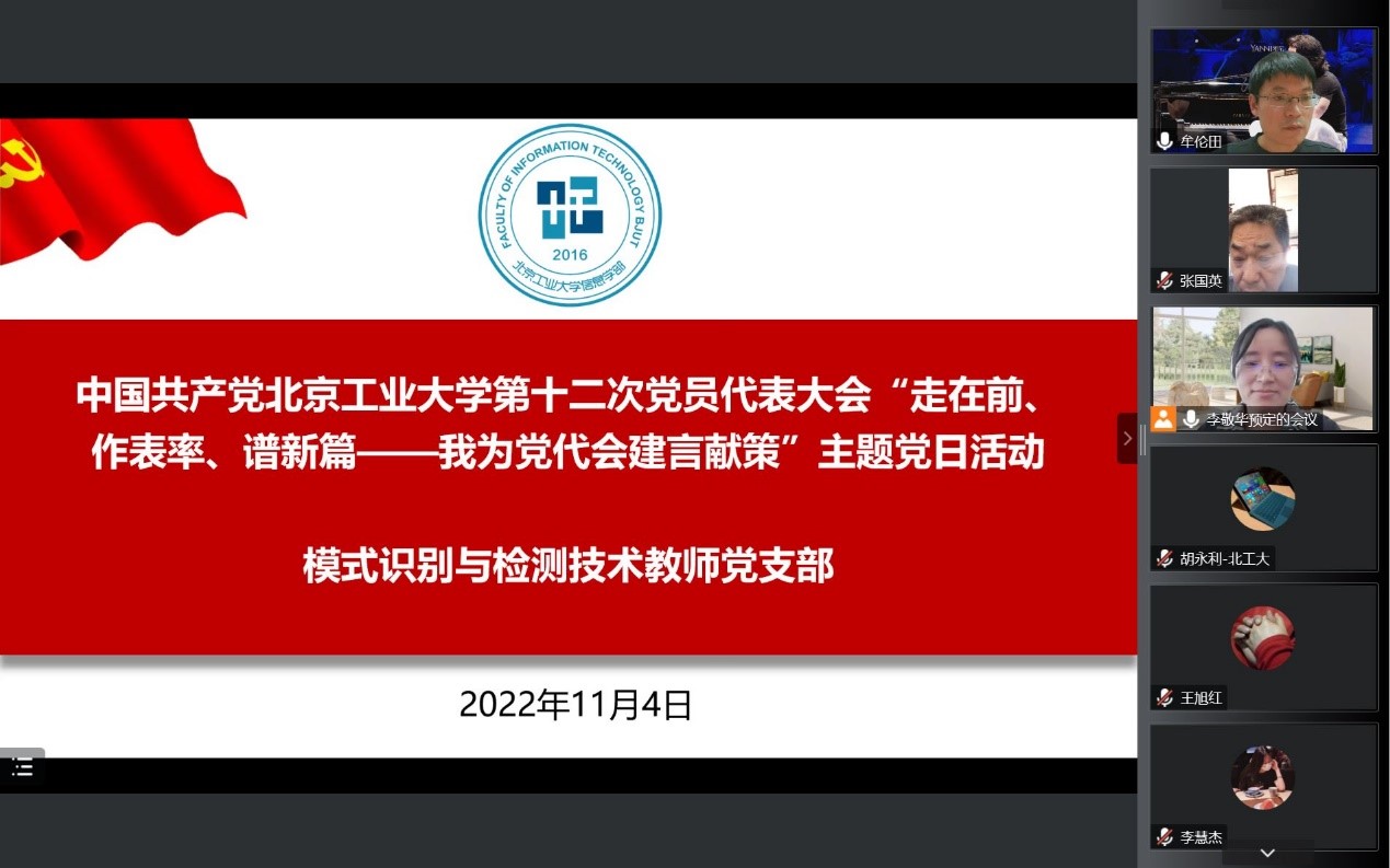 11月4日中午,信息学部模式识别与检测技术教师党支部线上召开了“走在前、作表率、 谱新篇——我为党代会建言献策”主题党日活动。会议由支部书记李敬华主持,全体党员、民主党派教师以及学习小组的群众教师参加了此次会议。