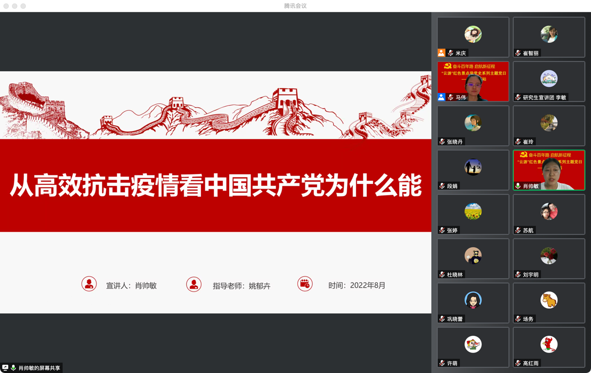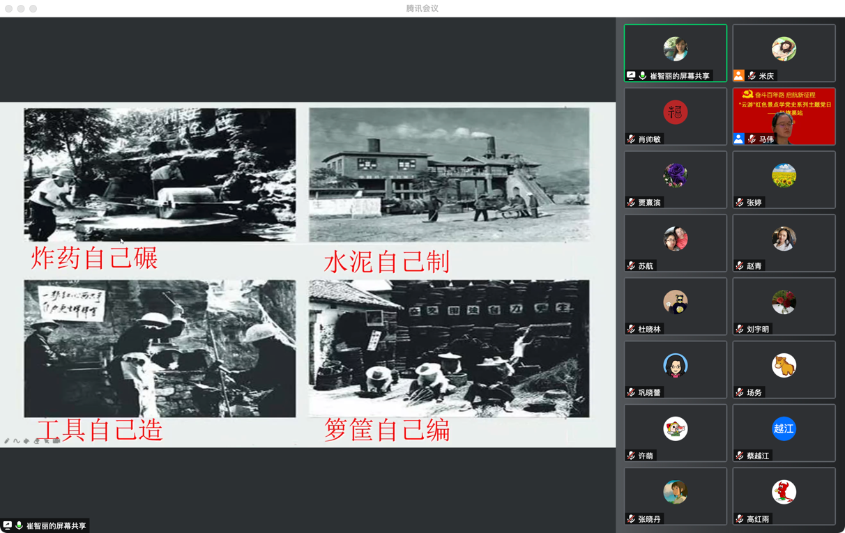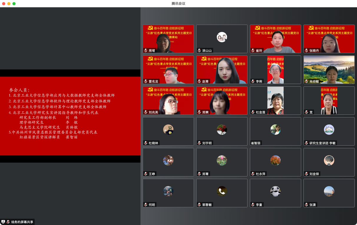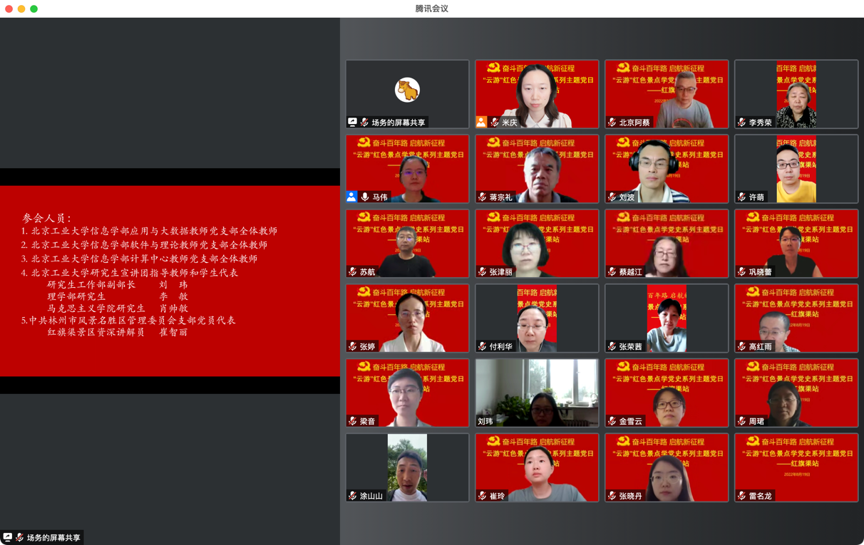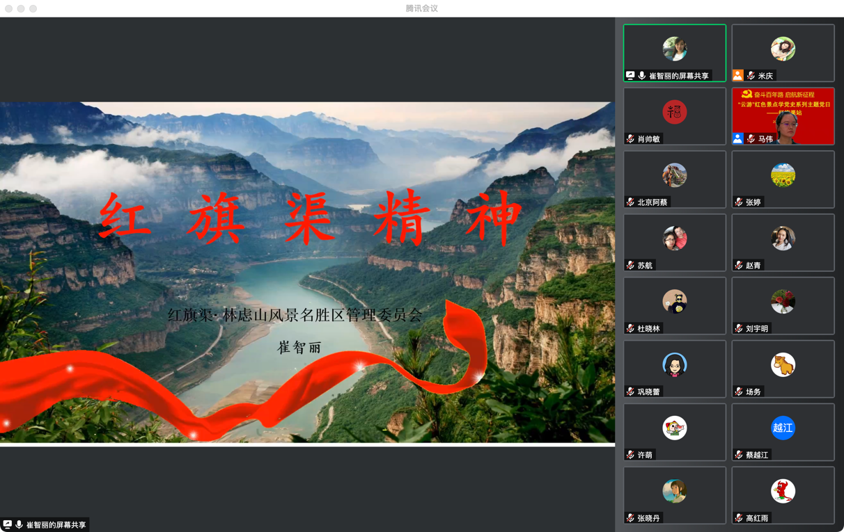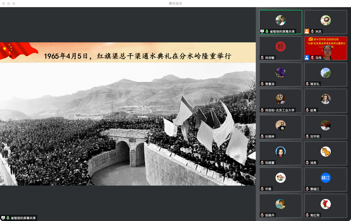 为进一步推动党史学习教育走深走实,增强党组织的凝聚力和战斗力,引导广大党员传承红色基因、赓续红色血脉,信息学部应用与大数据教师党支部联合信息学部软件与理论教师党支部、信息学部计算中心教师党支部、十大正规买足球网站研究生宣讲团、中共林州市风景名胜区管理委员会支部于8月19日14:00举行“‘云游’红色景点学党史——红旗渠站”主题党日活动,深入推进党史学习教育常态化。活动共分为三个环节,通过腾讯会议线上进行,由信息学部应用与大数据教师党支部书记马伟主持,共有50余名党员和群众教师参加了此次活动。