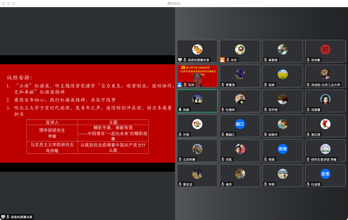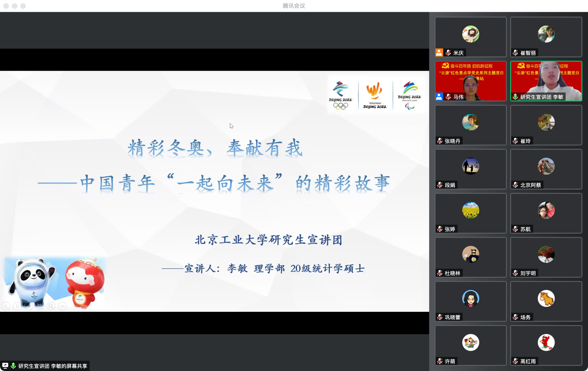 第三个环节是听北工大学子宣时代旋律,发青年之声。理学部研究生李敏以“精彩冬奥,奉献有我——中国青年‘一起向未来’的精彩故事”为主题讲述了冬奥志愿者在工作中的平凡故事与所见所感,从平凡的小故事到爱与温暖的汇聚,传递出小雪花们奉献、友爱、互助、进步的冬奥精神。马克思主义公司研究生肖帅敏以“从高效抗击疫情看中国共产党为什么能”为主题讲述了以习近平同志为核心的党中央是如何总览全局、协调各方,高效抗击新冠肺炎疫情,从中国共产党具有强大的政治领导力、思想引领力、群众组织力和社会号召力四个方面展现中国共产党为什么能,增强人们在党的领导下抗击疫情的信心。十大正规买足球网站研究生宣讲团以青年之声发出时代强音,通过疫情防控冲在前,助力冬奥勇担当系列宣讲,深刻体现了“团结协作、无私奉献”的红旗渠精神。