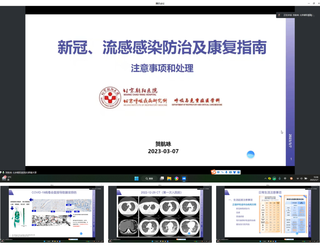 为了提高教职工的健康意识,了解新冠、流感的防治和康复方法,提高工作效率和生活质量,2023年3月7日,信息学部工会开展了“新冠、流感感染防治及康复指南” 健康讲座。本次讲座的主讲人是北京朝阳医院呼吸与危重症医学科主任医师贺航咏博士。信息学部的100余名老师在线参与了此次讲座。