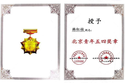 2023年5⽉,韩红桂荣获第三⼗五届“北京⻘年五四奖章”,该奖项是北京市授予北京⻘年的最⾼荣誉。