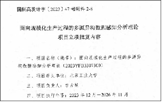 2023年12月,李方昱为项目负责人的2023年度“十四五”国家重点研发计划“面向规模化生产过程的多源异构数据感知分析理论”项目获得批复立项。面向我国工业软件受制于人的重大问题以及制造强国建设的重大需求,针对大规模复杂制造过程的多源异构数据采集、处理与应用部署周期长、利用率低等问题,研究制造资源的异构数据采集处理技术。