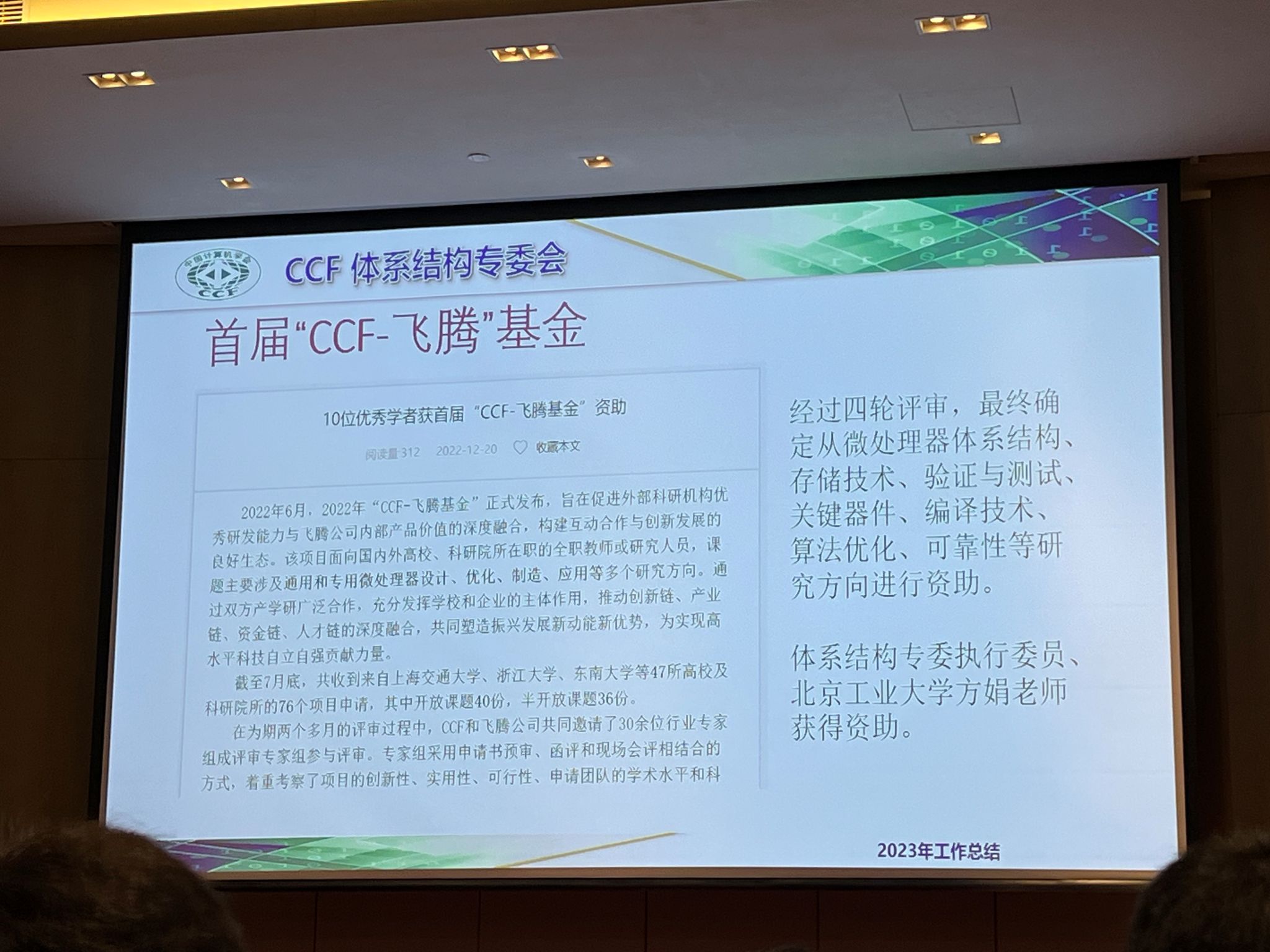 在CCF体系结构专委会的工作报告环节,回顾了首届“CCF-飞腾”基金的资助情况和项目进展情况。2022年6月,2022年“CCF-飞腾基金”正式发布,旨在促进外部科研机构优秀研发能力与飞腾公司内部产品价值的深度融合,构建互动合作与创新发展的良好生态。该项目面向国内外高校、科研院所在职的全职教师或研究人员,课题主要涉及通用和专用微处理器设计、优化、制造、应用等多个研究方向。该项目共收到来自上海交通大学、浙江大学、东南大学等47所高校及科研院所的76个项目申请,其中开放课题40份,半开放课题36份。经过为期两个月的四轮评审,最终确定从微处理器体系结构、存储技术、验证与测试、关键器件、编译技术、算法优化、可靠性等研究方向上对来自上海交通大学、复旦大学、浙江大学、东南大学、武汉大学、湖南大学、电子科技大学、中山大学、广东工业大学、十大正规买足球网站的申请项目进行资助。CCF体系结构专委执行委员、公司信息学部方娟教授荣获此项资助。