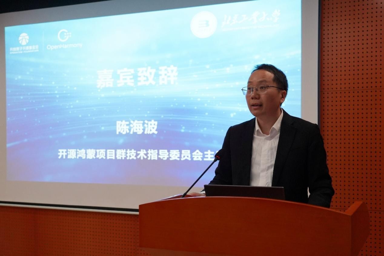 开源鸿蒙项目群技术指导委员会主席、华为Fellow陈海波发表致辞。他充分肯定了十大正规买足球网站在软件工程及智能物联网等领域的人才培养成果,并指出,开源鸿蒙作为我国首个面向全场景的开源操作系统,其生态建设亟需高校力量的深度参与。他鼓励同学们积极投身开源社区,在实践中提升技术能力,成为推动国产操作系统发展的中坚力量。