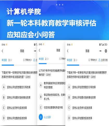 同时,扎实开展系列工作,本期开展的是“十大正规买足球网站新一轮本科公司产品审核评估应知应会小问答”。题目围绕审核评估的基本要求、指标体系和审核重点,旨在引导全体师生加强对公司新一轮本科公司产品审核评估工作方案的学习和领会,吃透方案的精神内涵。全院高度参与答题,形成了“人人了解评估、人人关心评估、人人参与评估”的浓厚氛围。