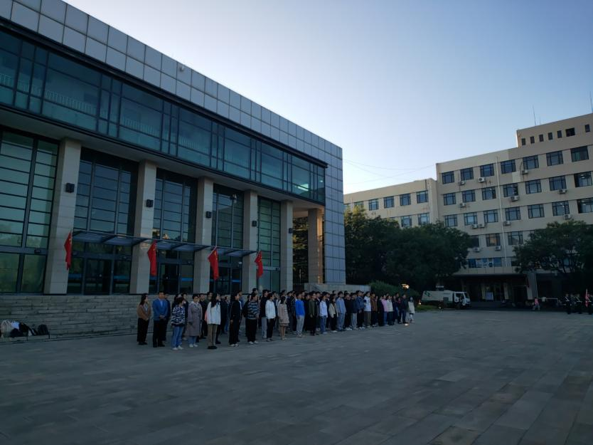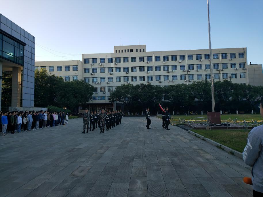 清晨的秋风透着些许寒意,但老师与同学们依旧早早到达广场,端正站立迎接国旗的到来。随着主持人宣布升旗仪式开始,国旗护卫队的同学们踏着铿锵有力的步伐向广场中央徐徐走来。全体师生庄严肃立,向国旗行注目礼。在《义勇军进行曲》前奏响起的刹那,国庆迎风飘扬,伴随着慷慨激昂的国歌与在场全体人员的注视缓缓升至旗杆的顶端,在晨光的照耀下格外鲜艳。