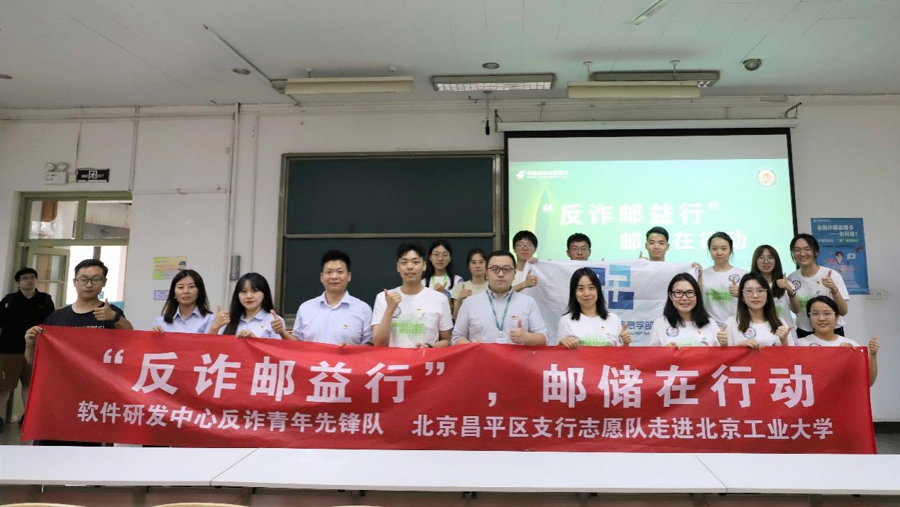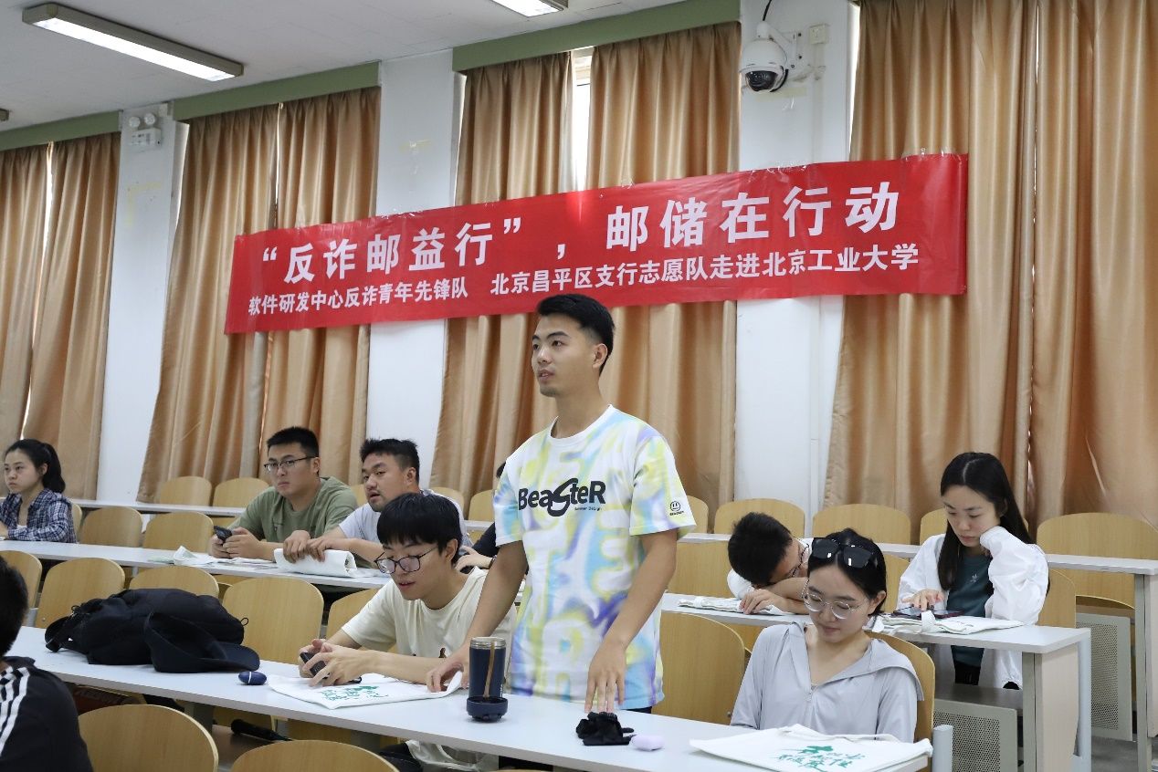 座谈会后,中国邮政储蓄银行总行软件研发中心反诈青年先锋队、北京昌平区支行志愿队,信息学部师生代表来到信息楼北侧阶梯教室开展反诈宣传活动。