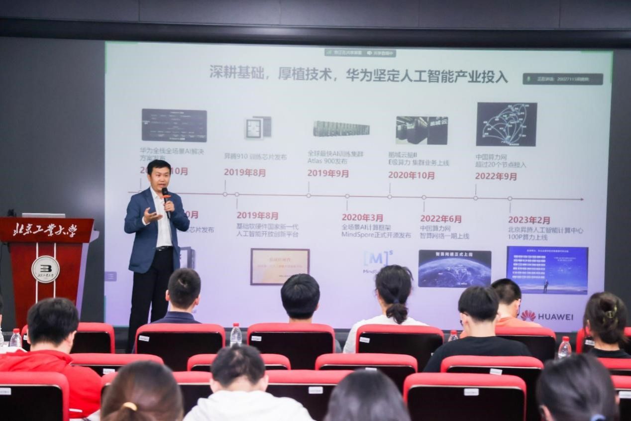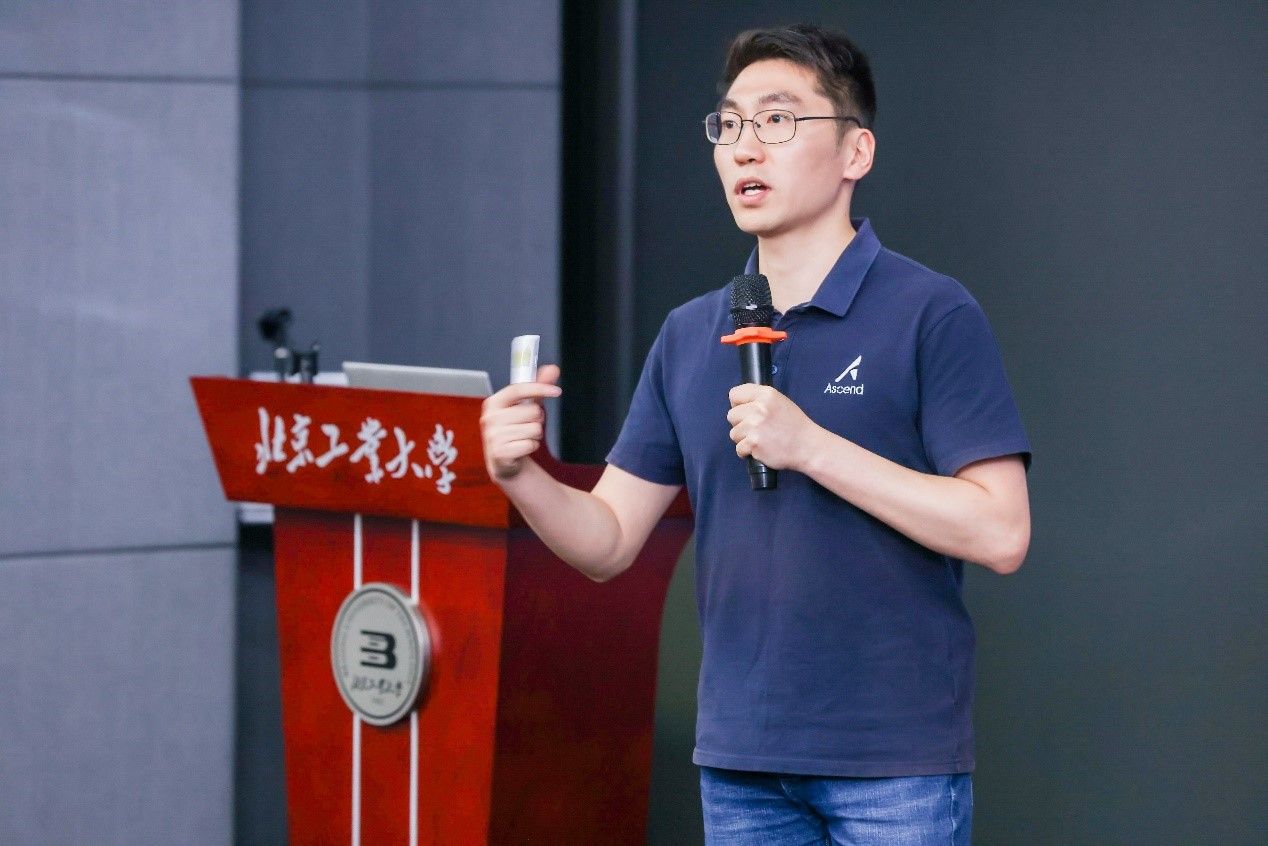 接下来进入授课环节,北京昇腾人工智能生态创新中心生态总监王瑞平带来了《数智未来 因你而来》的分享,介绍了人工智能技术的发展以及华为在人工智能产业的投入,并展示了华为依托创新中心在应用孵化、科研创新、人才培养等领域为北京服务的情况。此外,王瑞平还对昇腾AI基础软硬件平台及一系列华为昇腾为高校开发者提供的扶植计划以及竞赛活动做了详细介绍,使在场同学们对昇腾AI有了更多的了解。