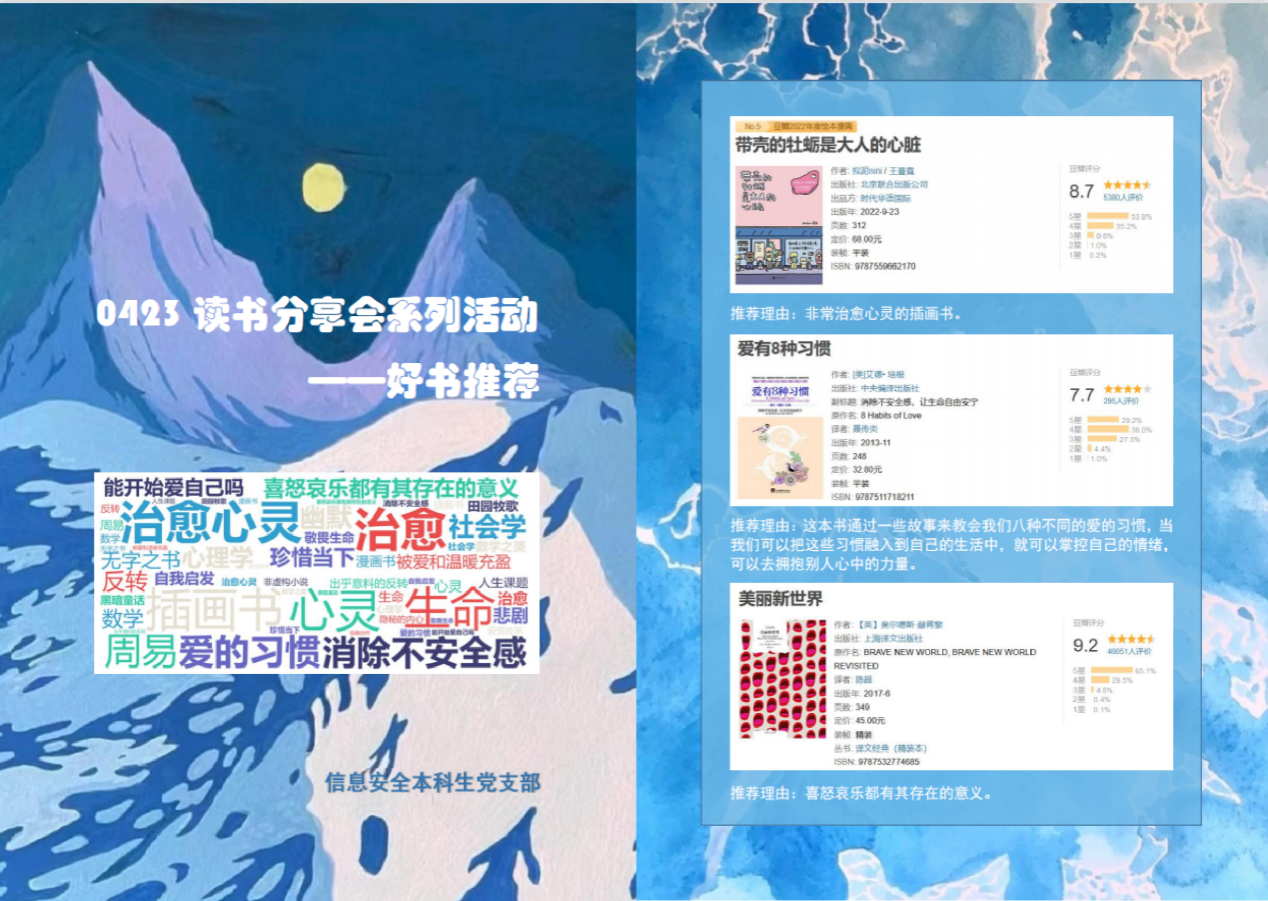 4月10日起,信息安全本科生党支部发起了“信安人心中的年度图书”征集活动。支部内的同学们踊跃分享了自己最喜欢或者最想推荐的一本书,并充分表达了自己的推荐理由。