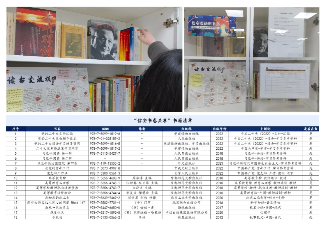 4月15日起,信息安全本科生党支部启动了“信安书卷共享”计划,包括流动图书角、整理书籍清单、建立借阅机制、设置读书交流板四个模块,满足了同学们捐书共读、借阅书籍、与他人交流阅读心得等要求。