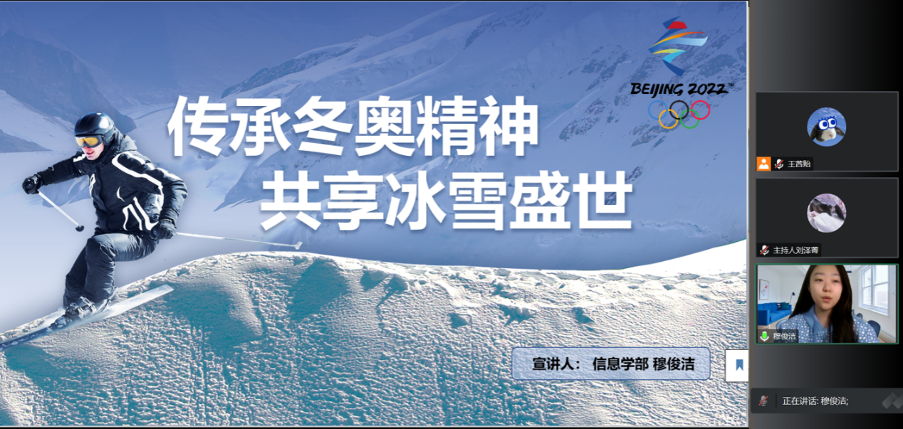 为发扬冰雪精神,推动冬奥文化传承,信息学部团委组织召开了初级团校第七讲。本次团校邀请到信息学部研究生宣讲团成员穆俊洁同学为大家带来冬奥精神宣讲。本次团校由团直组织部刘泽菁主持。