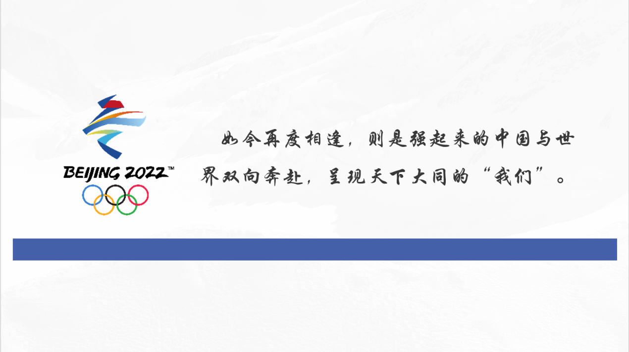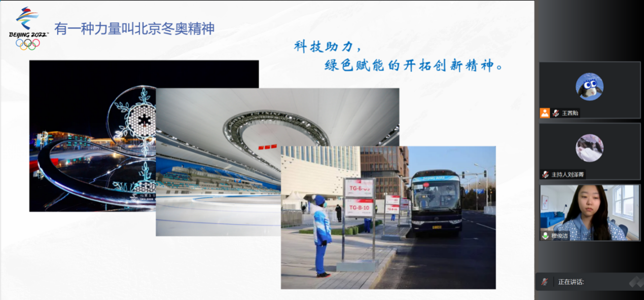在此之后,她为我们讲解了我国的冬奥精神在整个世界舞台上的深远影响。北京作为第一个双奥之城,实现了中国奥运的百年梦想,开启了奥林匹克新起点,成为国际奥林匹克文化传播中心和世界文明交流互鉴的大舞台。从08年的夏季奥运会到22年的冬季奥运会,14年间我们再一次向世界人民展现中国力量,带来惊喜和浪漫。冬奥带给我们的财富永远流传在世界人民心中,成为一代代世界人民的精神财富。