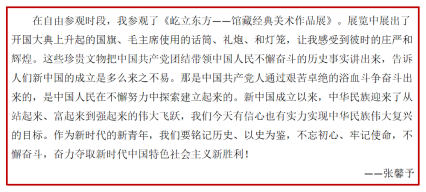在本次的国博参观活动中,同学们首先跟随公益讲解员一同领略中华民族谱写的团结奋斗、自强不息的壮丽史诗。集体参观结束后,同学们在“人格的力量——中国共产党人的家国情怀”展厅党旗下合影,并分小组在中国古代瓷器展、中国古代书画、中国古代饮食文化展等展厅自由参观,感受家国力量,增强家国情怀。
