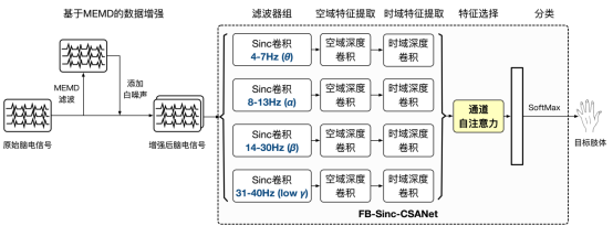 针对运动想象对应目标肢体的识别精度不足的问题,课题组成员研究了现有深度学习方法的改进方法,提出了基于通道注意力的多分支脑电信号分类模型,并结合多分支网络的结构特点,提出了新的频段交换数据增强方法以产生与原始样本相近的生成样本,进一步提高模型的性能,如图2所示。在公开数据集上的实验结果表明,项目组提出的方法可以显著提高多分类运动想象解码的分类准确率,为基于通道注意力和滤波器组结构设计模型的运动想象解码方法提供了新的思路。成果于2022年发表在脑机接口领域高级别期刊Journal of Neural Engineering(SCI检索,JCR一区)。