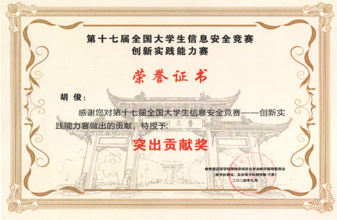 教师胡俊获得全国老员工信息安全竞赛创新实践能力突出贡献奖