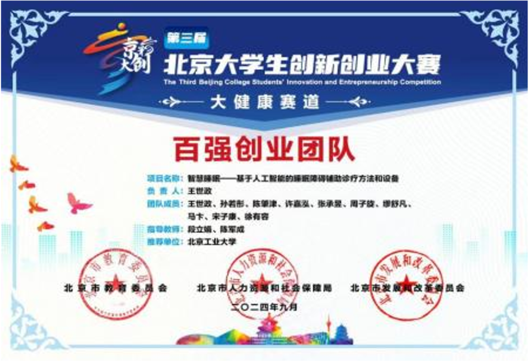 王世政、孙若彤、陈肇津、许嘉强、张承昱、周子旋、缪舒凡、马卞、宋子康、徐有容《智慧睡眠-基于人工智能的睡眠障碍辅助诊疗方法和设备》项目荣获百强创业团队奖(指导老师:段立娟、陈军成)
