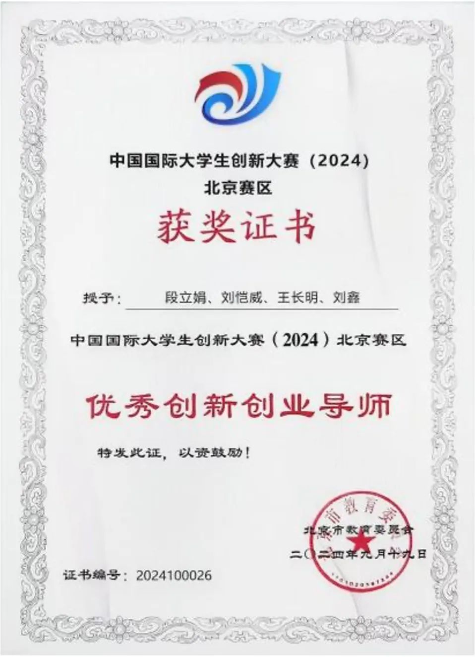 段立娟、刘恺威、王长明、刘鑫获北京赛区优秀创新创业导师奖