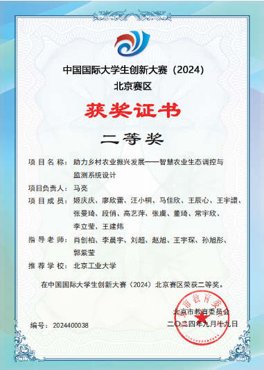 马亮、姬庆庆、廖欣蕾、汪小桐、马佳欣、王辰心、王宇譞、张曼琦、段俏、高艺萍、张虞、董琦、常宇欣、李立莹、王建炜《助力乡村农业振兴发展——智慧农业生态调控与监测系统设计》荣获北京赛区二等奖(指导教师:肖创柏、李晨宇、刘超、赵旭、王宇琛、孙旭彤、郭紫莹)