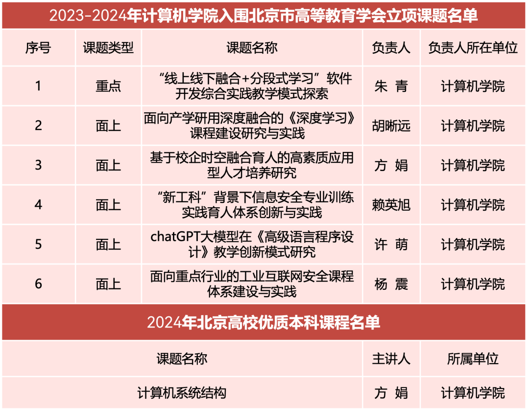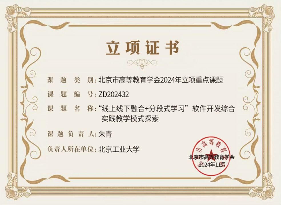依托产教融合平台,精准定位通识教育体系,形成了有特色品牌效应的“北京市育人榜样”团队团队。2部教材获批“十四五”国家级规划教材拟推荐名单,1门课程获批北京市高校优质本科课程,6项成果入围北京市高等教育学会2023年度、2024年度立项,指导5篇论文获批北京市优秀毕业论文。