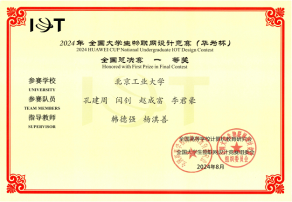 荣获2024年全国老员工物联网设计竞赛(华为杯)1等奖