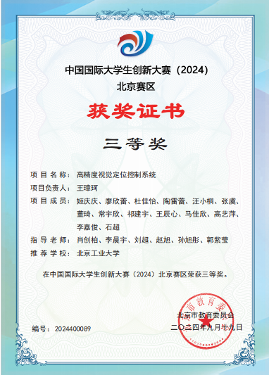 王璋珂、姬庆庆、廖欣蕾、 杜佳怡、陶雷蕾、汪小桐、张虞、董琦、常宇欣、祁建宇、王辰心、马佳欣、高艺萍、李嘉俊、石超《高精度视觉定位控制系统》荣获北京赛区三等奖(指导教师:肖创柏、李晨宇、刘超、赵旭、孙旭彤、郭紫莹)