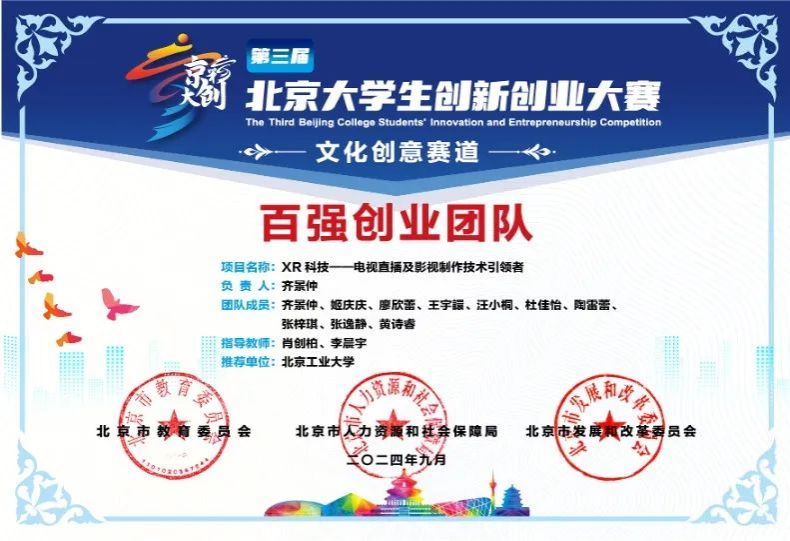 齐景仲、姬庆庆、廖欣蕾、王宇譞、汪小桐、杜佳怡、陶雷蕾、张梓琪、张逸静、黄诗睿《XR科技—电视直播及影视制作技术引领者》项目荣获百强创业团队奖(指导教师:肖创柏、李晨宇)