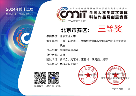 贾梓含、刘艺冰、索春祥、魏阿曼、吴菲同学《“数”说北京——首都博物馆辉煌中轴展厅虚拟现实游览系统》项目荣获北京赛区三等奖(指导教师:齐娜)