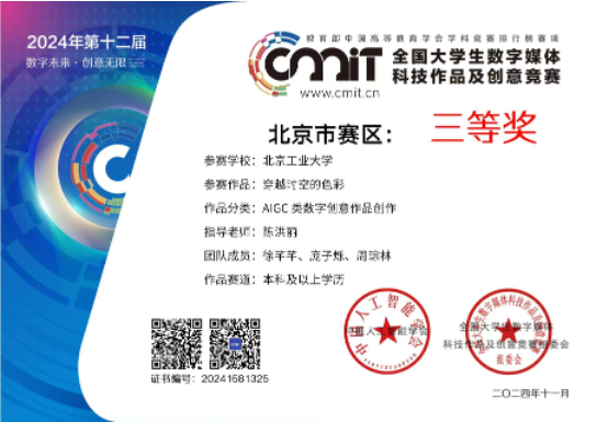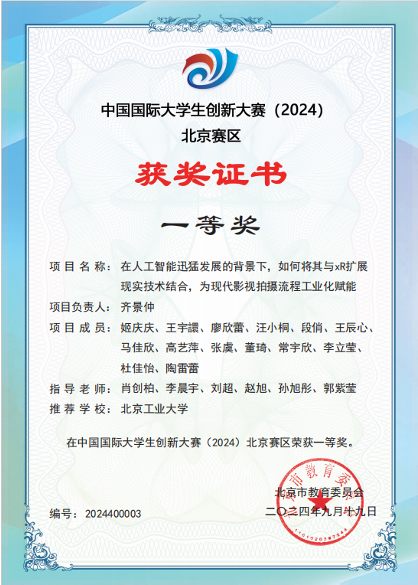 齐景仲、姬庆庆、王宇譞、廖欣蕾、汪小桐、段俏、王辰心、马佳欣、高艺萍、张虞、董琦、常宇欣、李立莹、杜佳怡、陶雷蕾《在人工智能迅猛发展的背景下,如何将其与xR扩展现实技术结合,为现代影视拍摄流程工业化赋能》荣获北京赛区一等奖(指导教师:肖创柏、李晨宇、刘超、 赵旭、孙旭彤、郭紫莹)