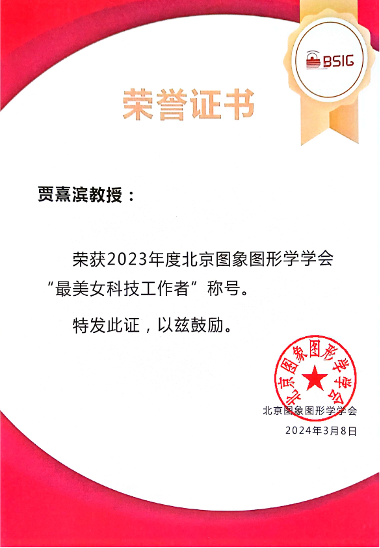 北京图象图形学学会为了更好的发挥科研创新中的女性力量,鼓励更多女性进入科研领域成为高层次科研人才,有力地推动科学技术的创新、进步和发展,2024年3月,发布北京图象图形学学会遴选2023年“最美女科技工作者”称号名单,贾熹滨教授获得北京图象图形学学会“最美女科技工作者”称号。
