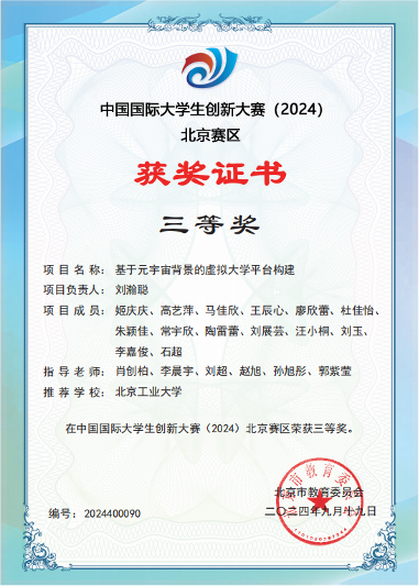 刘瀚聪、姬庆庆、高艺萍、马佳欣、王辰心、廖欣蕾、杜佳怡、朱颖佳、常宇欣、陶雷蕾、刘展芸、汪小桐、刘玉、李嘉俊、石超《基于元宇宙背景的虚拟大学平台构建》荣获北京赛区三等奖(指导教师:肖创柏、李晨宇、刘超、赵旭、孙旭彤、郭紫莹)