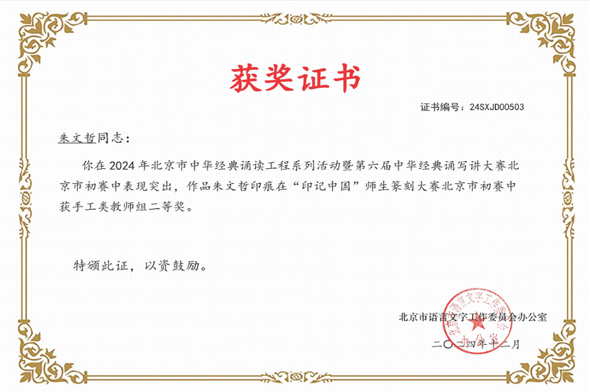 2024年12月,在北京市中华经典诵读工程系列活动暨第六届中华经典诵写讲大赛北京市初赛中,朱文哲的篆刻作品《印痕》在“印记中国”师生篆刻大赛北京市初赛中荣获手工类教师组二等奖。