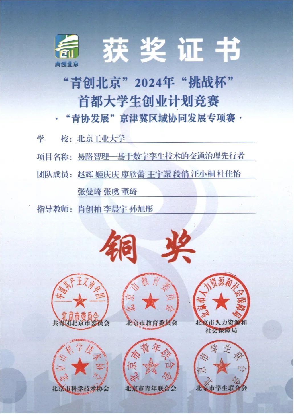赵辉、姬庆庆、廖欣蕾、王宇譞、段俏、汪小桐、杜佳怡、张曼琦、张虞、董琦《易路智理—基于数字孪生技术的交通治理先行者》荣获“青协发展”京津冀区域协同发展专项赛 铜奖(指导教师:肖创柏、李晨宇、孙旭彤)
