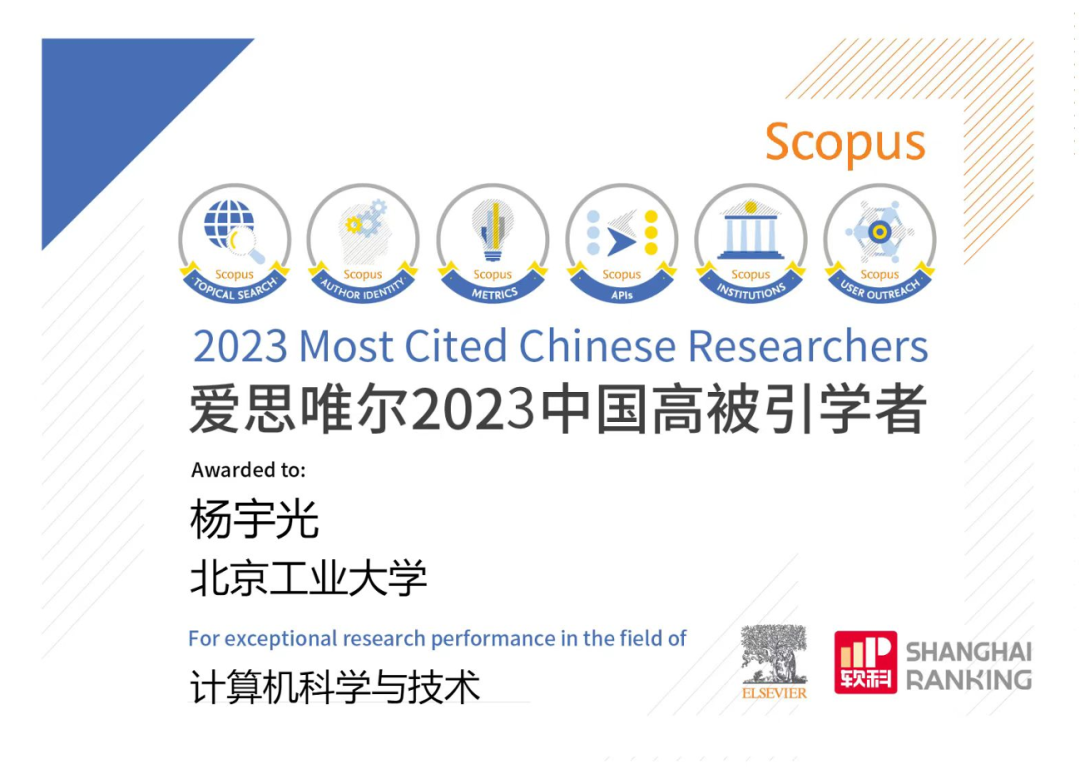 2024年3月27日,爱思唯尔(Elsevier)发布2023“中国高被引学者”(Highly Cited Chinese Researchers)榜单。该榜单以全球权威的引文与索引数据库Scopus作为科研成果统计来源,采用上海软科开发的方法,系统性地展示了中国科研领域的人才分布现状,呈现各机构、高校优势学科构成及学术影响力,以及在关键技术研究和各重点领域的顶尖人才。2023“中国高被引学者”上榜共计5801人,网络空间安全系杨宇光教授入选计算机科学与技术学科领域名单。