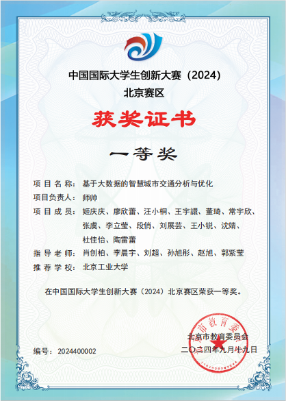 师帅、姬庆庆、廖欣蕾、汪小桐、王宇譞、董琦、常宇欣、张虞、李立莹、段俏、刘展芸、王小锐、沈婧、杜佳怡、陶雷蕾《基于大数据的智慧城市交通分析与优化》荣获北京赛区一等奖(指导教师:肖创柏、李晨宇、刘超、孙旭彤、赵旭、郭紫莹)