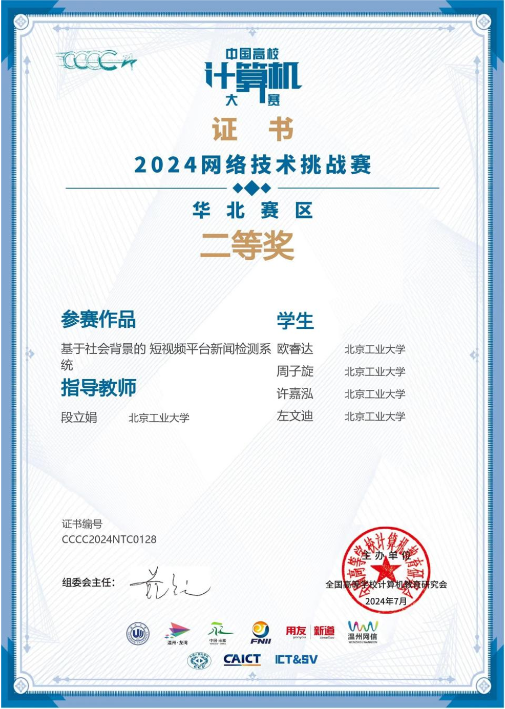 欧睿达、周子旋、许嘉泓、左文迪作品《基于社会背景的短视频平台新闻检测系统》获得华北赛区二等奖