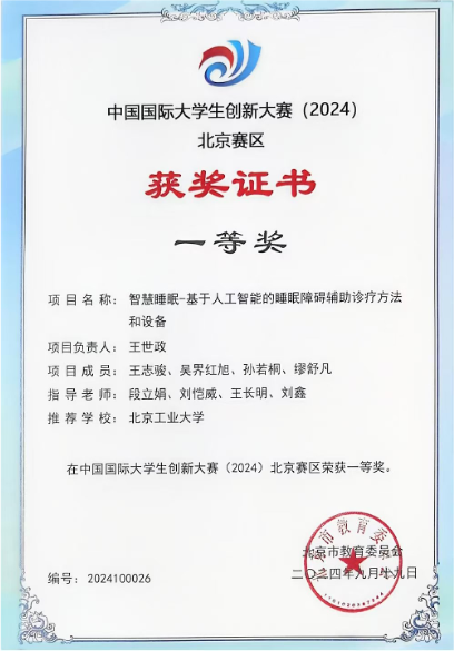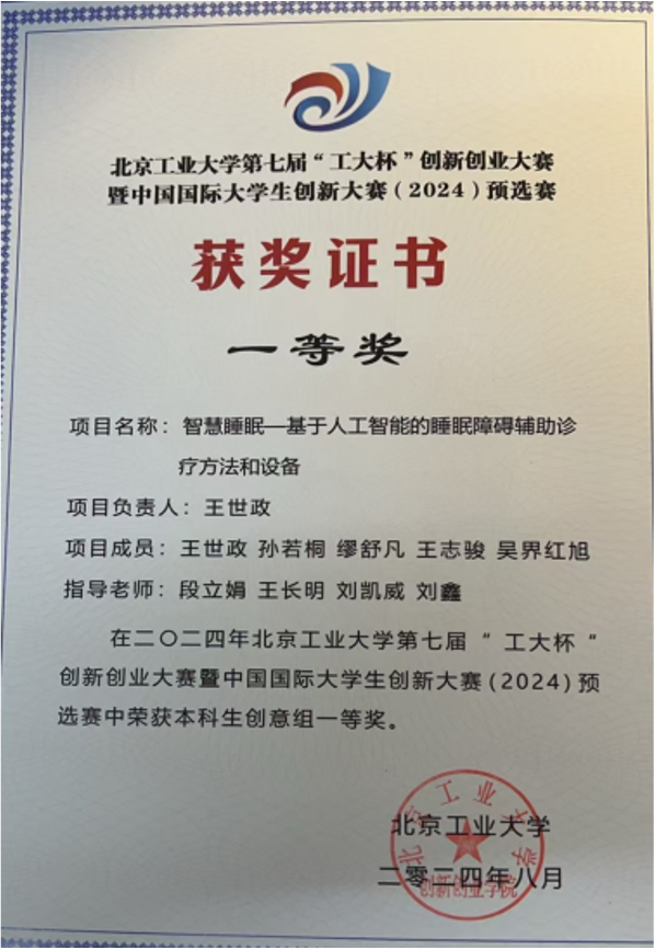 王世政、王志骏、吴界红旭、孙若桐、缪舒凡《智慧睡眠-基于人工智能的睡眠障碍辅助诊疗方法和设备》荣获北京赛区一等奖(指导教师:段立娟、刘恺威、王长明、刘鑫)