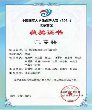 傅娆、姬庆庆、廖欣蕾、祁建宇、汪小桐、王宇譞、杜佳怡、陶雷蕾、段俏、杨未豪、沈婧、王小锐、王建炜、李嘉俊、石超《石化安全检测及预测预警技术》荣获北京赛区三等奖(指导教师:肖创柏、李晨宇、刘超、赵旭、孙旭彤、郭紫莹)