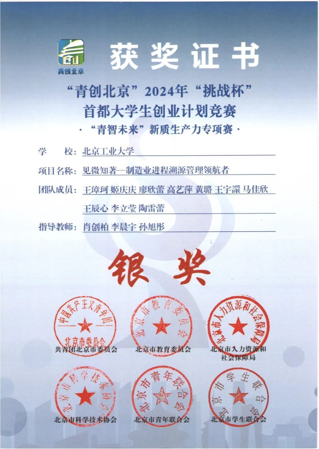 王璋珂、姬庆庆、廖欣蕾、高艺萍、黄璐、王宇譞、马佳欣、王辰心、李立莹、陶雷蕾《见微知著—制造业进程溯源管理领航者》荣获“青智未来”新质生产力专项赛 银奖(指导教师:肖创柏、李晨宇、孙旭彤)