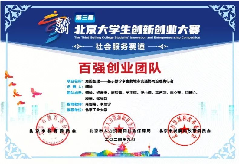 师帅、姬庆庆、廖欣蕾、王宇譞、汪小桐、高艺萍、李立莹、徐昕怡、段俏、张曼琦《易路智理—基于数字孪生的城市交通协同治理先行者》项目荣获百强创业团队奖(指导教师:肖创柏、李晨宇)