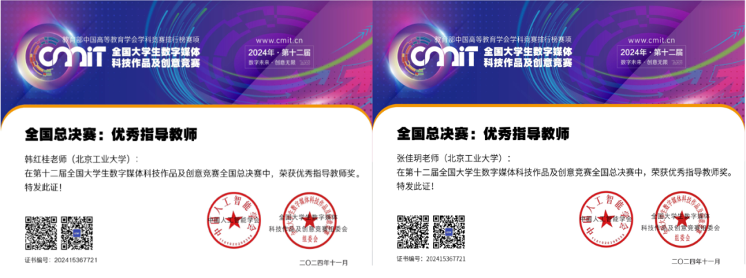 韩红桂、张佳玥2位老师荣获第十二届全国老员工数字媒体科技作品及创意竞赛全国总决赛优秀指导教师。