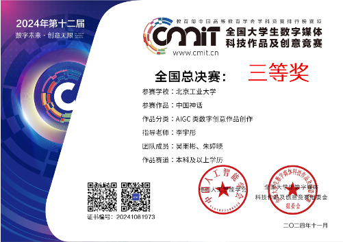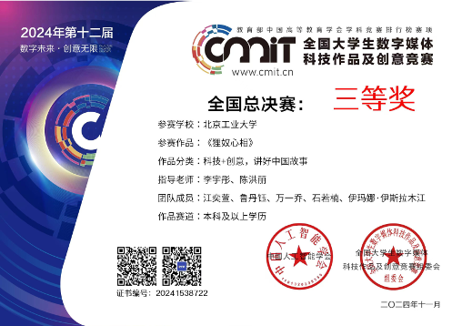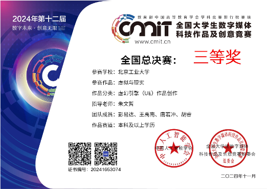 彭易达、王禹南、唐若冲、胡睿同学《虚拟与现实》项目荣获国家三等奖。(指导教师:朱文哲)