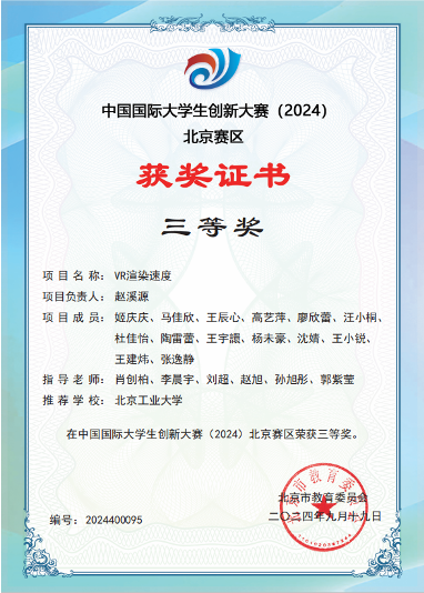 赵溪源、姬庆庆、马佳欣、王辰心、高艺萍、廖欣蕾、汪小桐、杜佳怡、陶雷蕾、王宇譞、杨未豪、沈婧、王小锐、王建炜、张逸静《VR渲染速度》荣获北京赛区三等奖(指导教师:肖创柏、李晨宇、刘超、赵旭、孙旭彤、郭紫莹)