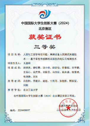 关晶硕、姬庆庆、廖欣蕾、汪小桐、徐昕怡、许馨懿、王宇譞、王辰心、高艺萍、刘展芸、马佳欣、杨未豪、张曼琦、张逸静、刘玉《人因与工效学专项命题:高端装备人因测试关键技术——基于柔性传感器的表面肌肉电信号检测技术》荣获北京赛区三等奖(指导教师:肖创柏、李晨宇、赵旭、宁芮可、孙旭彤、郭紫莹、刘超)