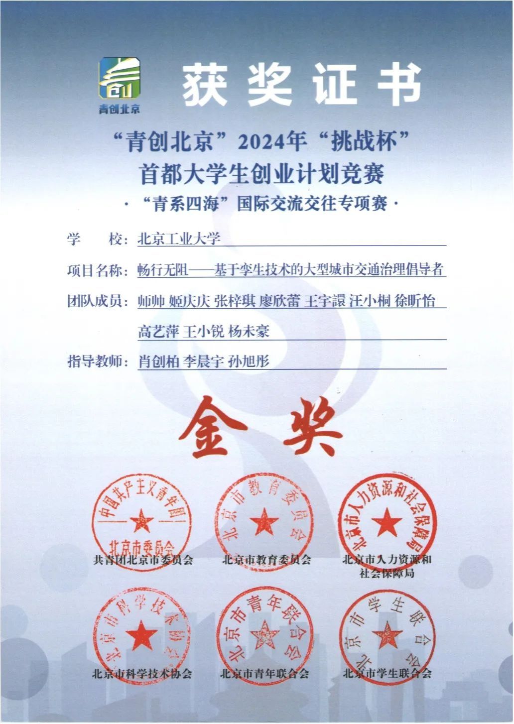 师帅、姬庆庆、张梓琪、廖欣蕾、王宇譞、汪小桐、徐昕怡、高艺萍、王小锐、杨未豪《畅行无阻—基于孪生技术的大型城市交通治理倡导者》荣获“青系四海”国际交往专项赛 金奖(指导教师:肖创柏、李晨宇、孙旭彤)